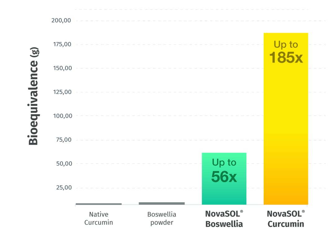 Como resultado, NovaSOL Boswellia/Curcumin Duo ofrece 56 veces mejor absorción de Boswellia Serrata2 que las formulaciones regulares... y 185 veces mayor absorción de la curcumina3 en comparación con la curcumina en polvo normal