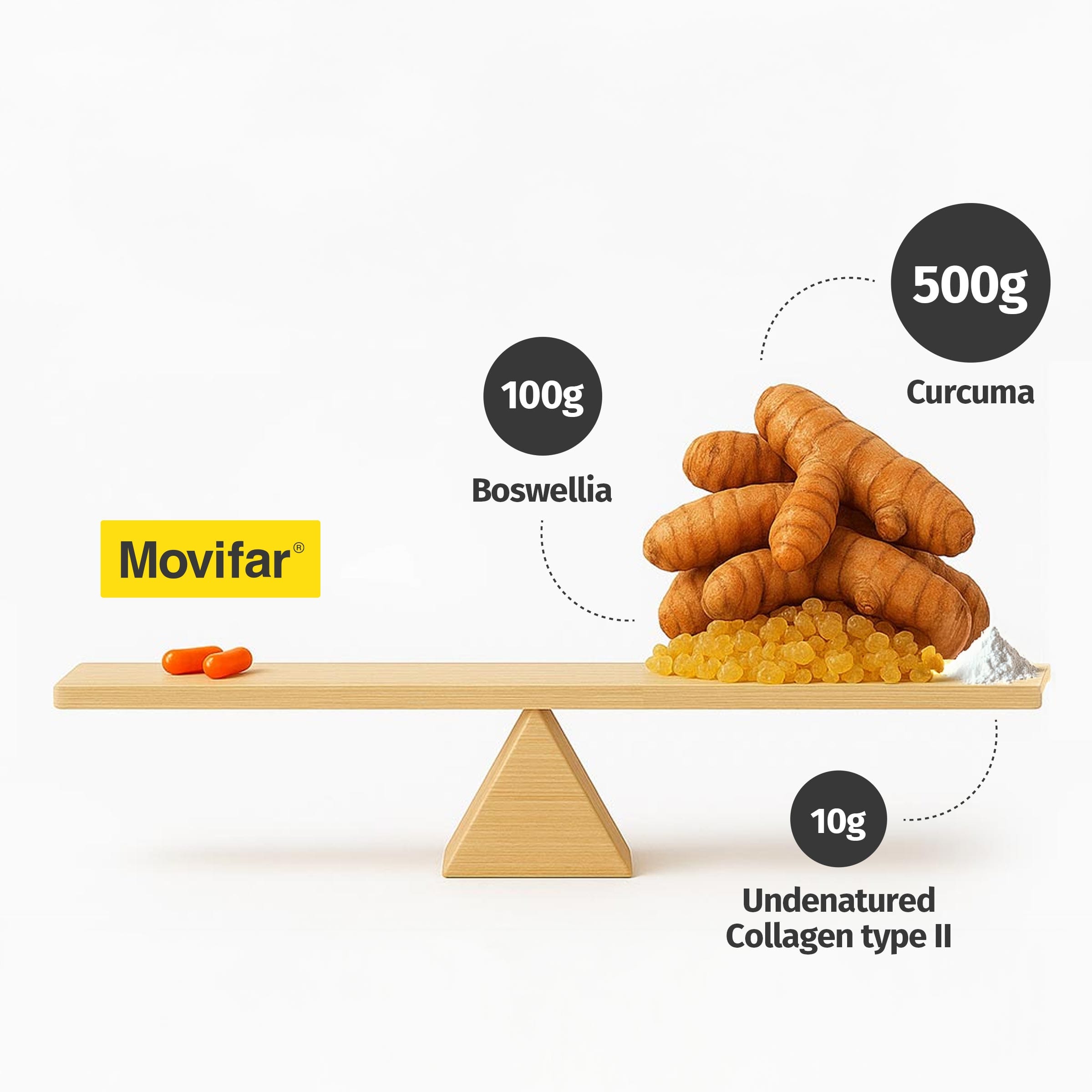 Así que con Movifar, obtendrás todos los beneficios de la Boswellia Serrata y la Curcuma Longa, pero sin ingredientes de relleno innecesarios que pueden hacer daño potencial a tu cuerpo.