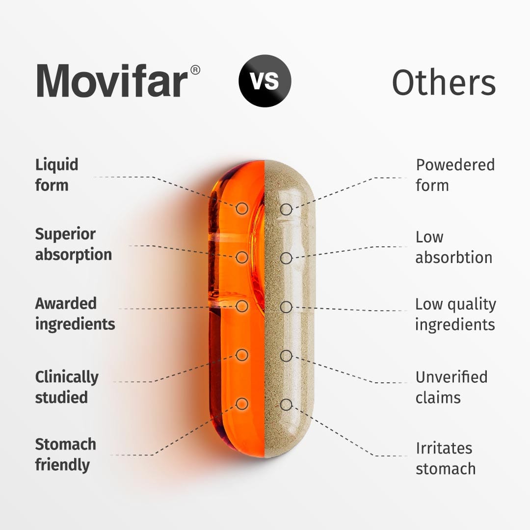 Movifar® resuelve este problema usando los ingredientes patentados NovaSOL Curcumin y NovaSOL Boswellia Serrata...