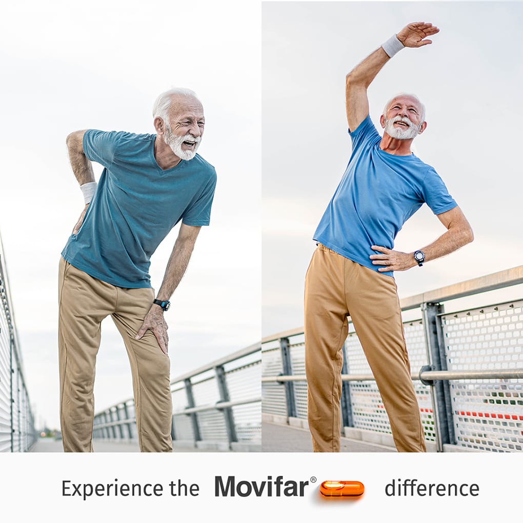 Movifar es una solución respaldada por la ciencia que por fin ofrece el mejor apoyo posible y completo para la función saludable de las articulaciones envejecidas. Y lo hace gracias a sus ingredientes patentados.